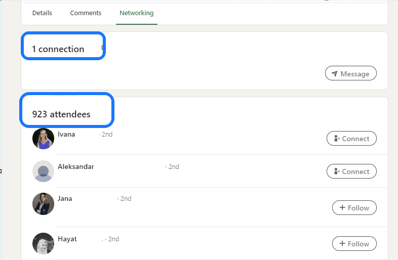 - Une fois que vous ouvrez l'onglet Réseautage, vous verrez les participants déjà filtrés. Faites défiler jusqu'en bas, et vous trouverez tous ceux qui participent à l'événement !